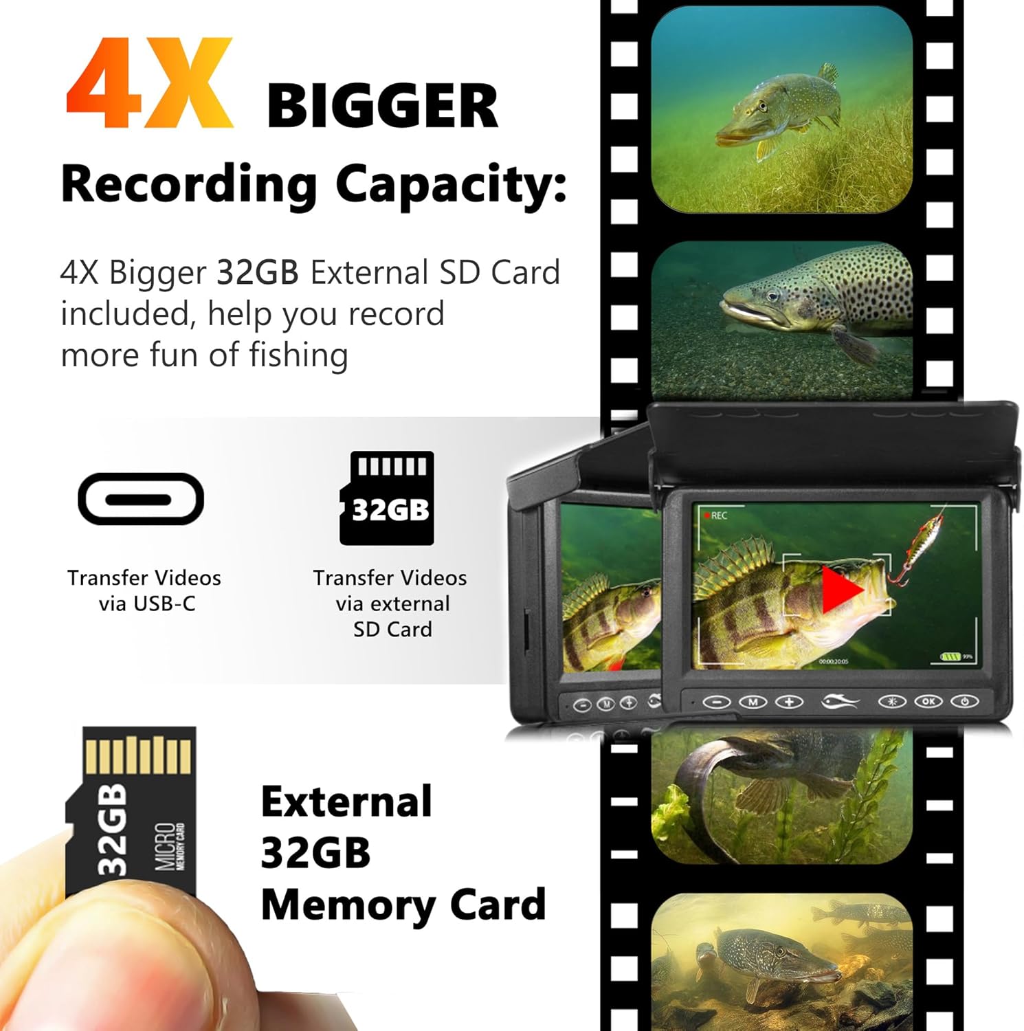 USB-C rechargeable 5000mAh battery for long-lasting fishing trips.