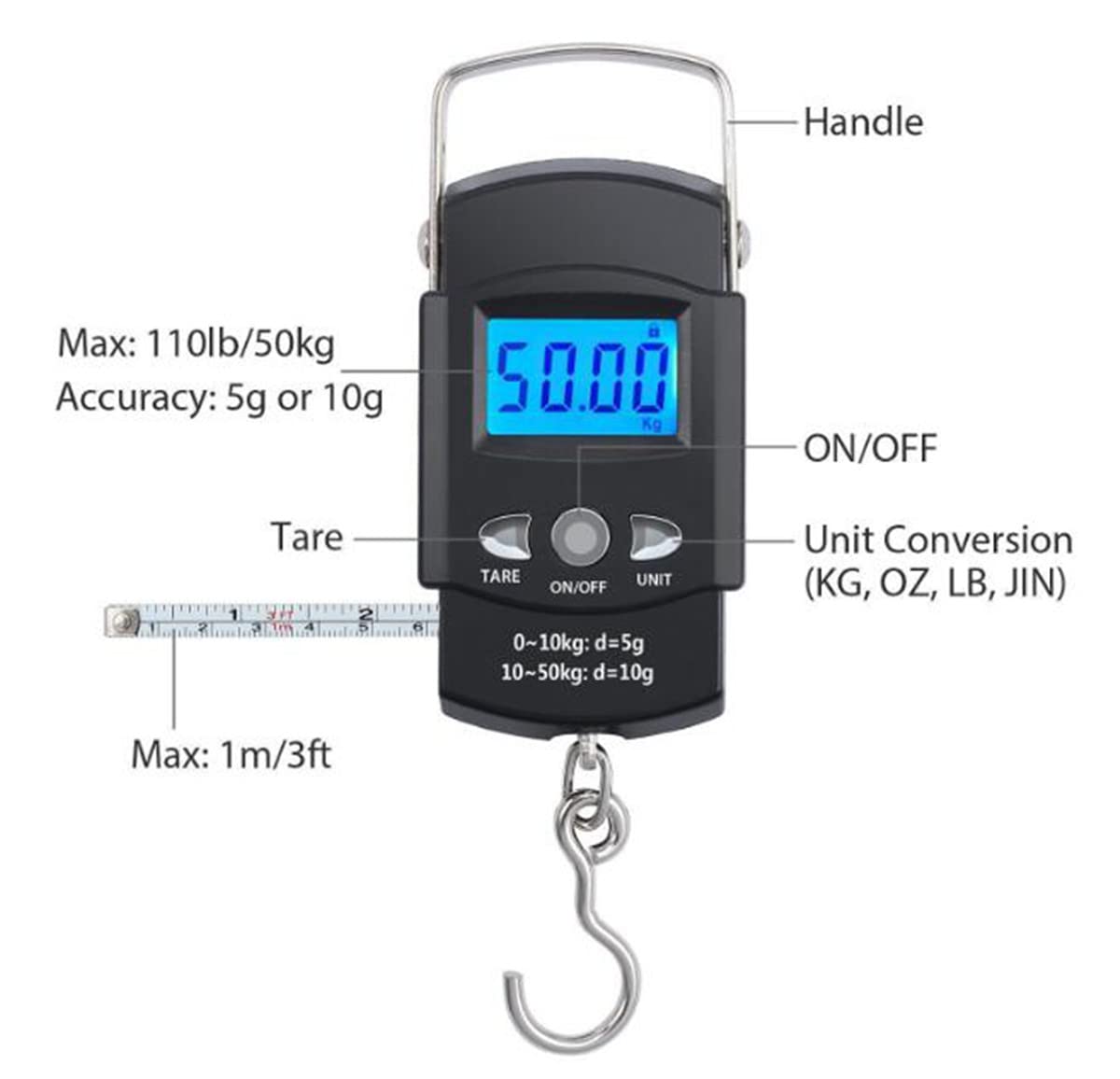 Equipped with a non-slip ABS handle and durable metal hook for secure weighing.