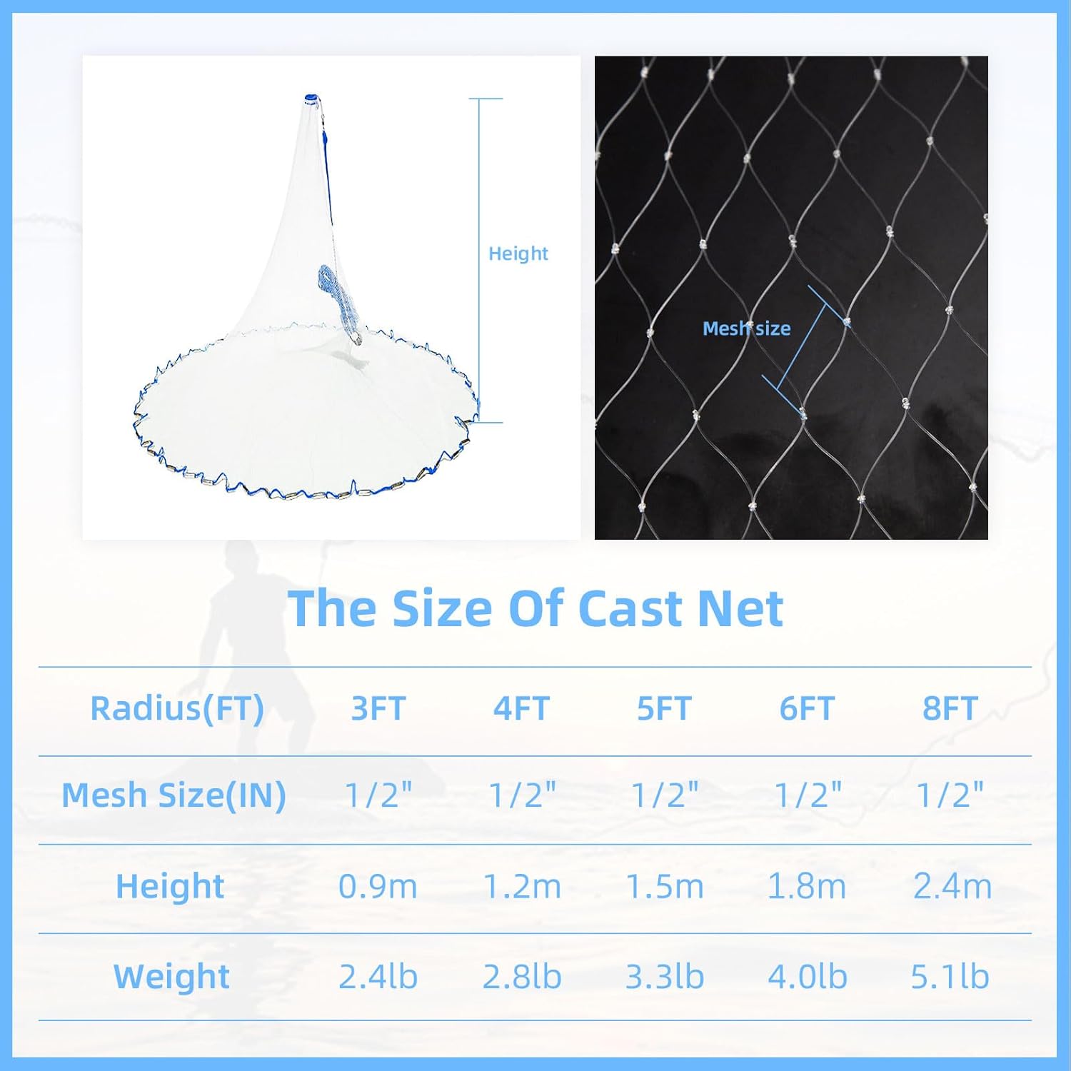 The 4ft Radius Saltwater Cast Net offers a durable and effective solution for bait fishing. Designed with heavy-duty zinc sinkers for quick and stable casting. Perfect for saltwater anglers seeking reliable and easy-to-use gear. The 3/8 inch mesh ensures optimal bait capture.