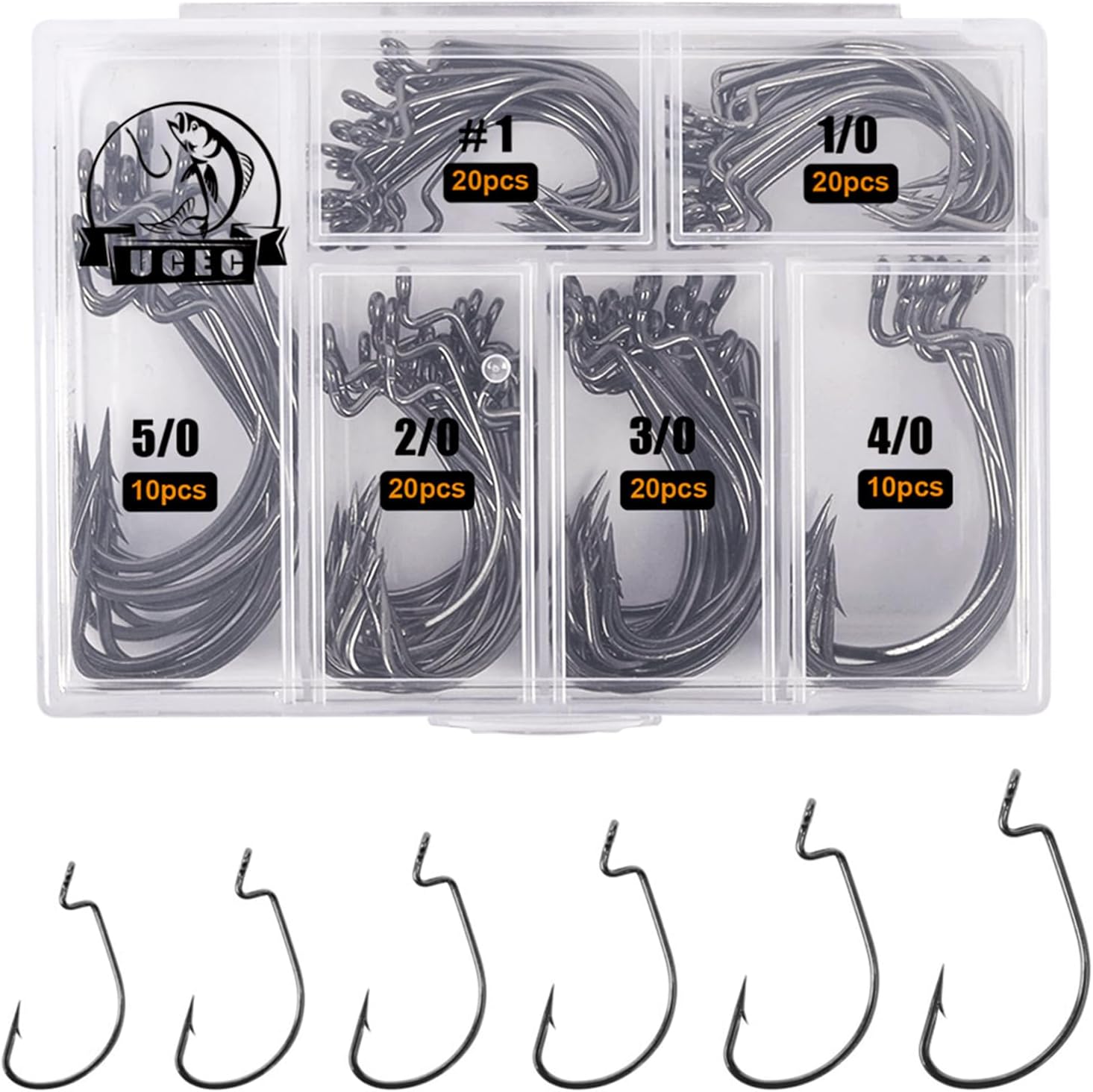 UCEC Fishing Hooks are designed for bass and trout fishing with an offset shank and extra-wide gap for better hook sets. Made of 2X strong carbon steel for durability. Ideal for both saltwater and freshwater fishing. Comes in a variety of sizes for different bait and fish species.