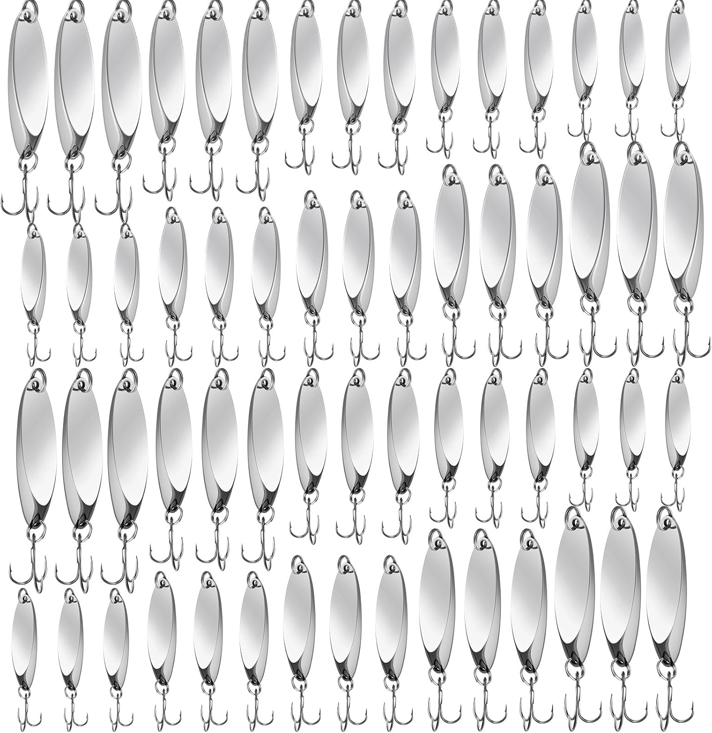 The HESTYA Fishing Lures with Treble Hooks from Angler Arsenal are designed for saltwater fishing. These hard metal spinner baits come in various sizes and feature durable treble hooks perfect for targeting salmon, bass, and other fish. The silver color ensures maximum visibility and attraction, making it an excellent choice for any angler.