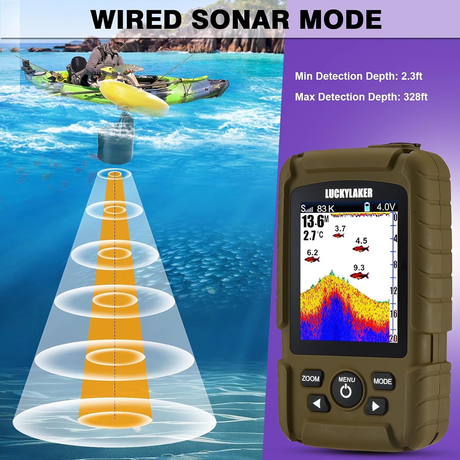 Ideal for kayak, boat, and ice fishing with a high-sensitivity transducer.