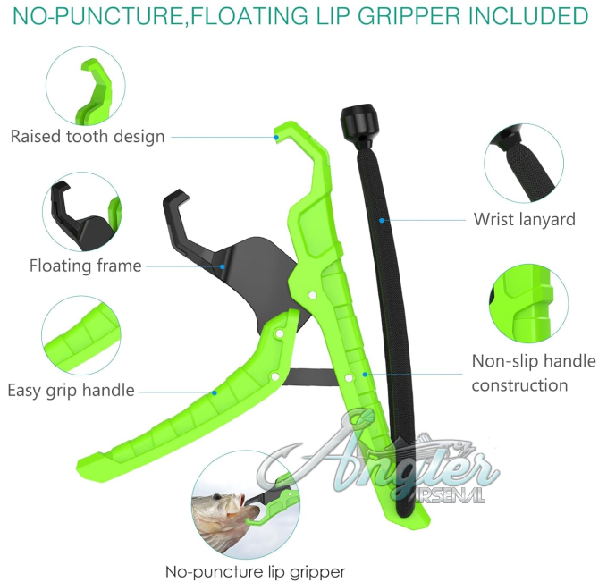 Equipped with a lip gripper for secure fish handling and a portable hanging design.