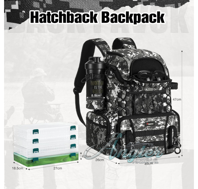 The Piscifun Fishing Backpack is designed for anglers who need a versatile and durable storage solution for their fishing gear. This waterproof bag features rod holders and includes four tackle boxes, providing ample space for organizing your baits and tackle. The integrated rain cover ensures your equipment stays dry in wet conditions, while the water-resistant fabric protects against splashes and spills. With a convenient bottle holder and a camouflage design, this backpack is perfect for fishing trips, camping, and outdoor adventures. A reliable choice for fishing enthusiasts, this backpack is available from Angler Arsenal.