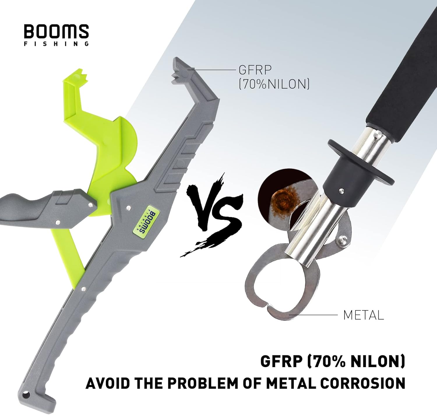 Booms Fishing G05 Fish Lip Gripper Saltwater by Angler Arsenal features a durable plastic design with a non-slip handle, perfect for safely holding fish. Comes with a lanyard for easy access during kayak fishing or other water activities. Ideal for saltwater and catfish fishing.