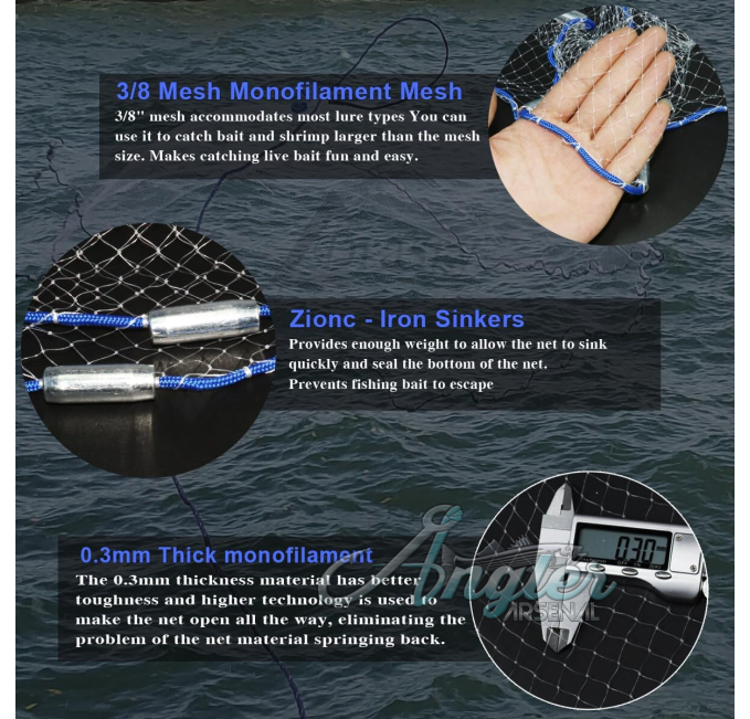 Features 3/8 and 1/4 mesh with heavy-duty gray sinker for faster sinking.