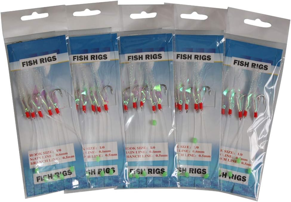 Includes 10 fishing rigs with flasher lures and glow beads.