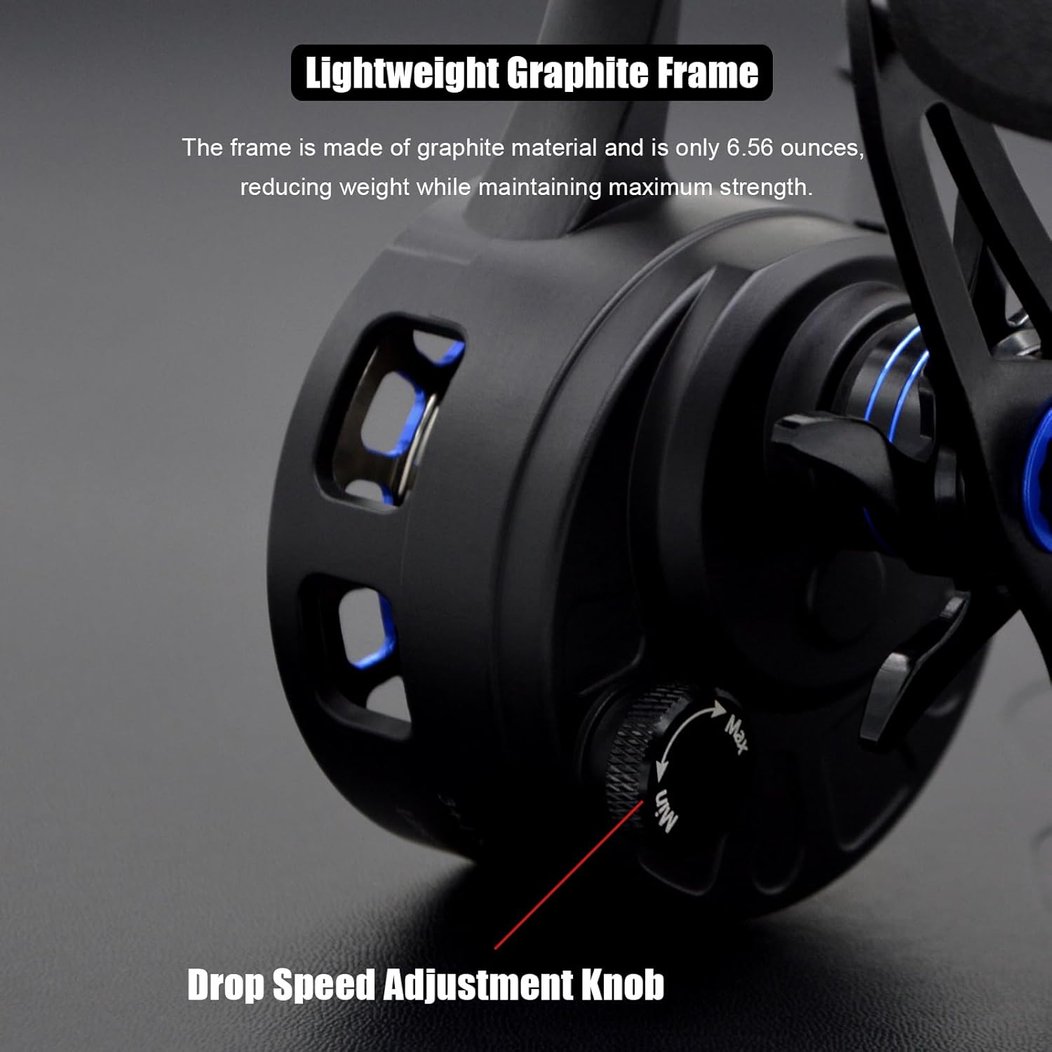 This Inline Ice Fishing Reel features a 3.21 high-speed gear ratio, providing quick line retrieval and enhanced performance for winter fishing. Equipped with 3+1 anti-reverse ball bearings, it ensures smooth operation and reliable control while reeling in your catch. The lightweight graphite frame combined with a CNC aluminum spool offers durability without adding unnecessary weight, making it easy to handle during long fishing sessions. Ideal for both novice and experienced anglers, this reel is designed to enhance your ice fishing experience with precision and efficiency.