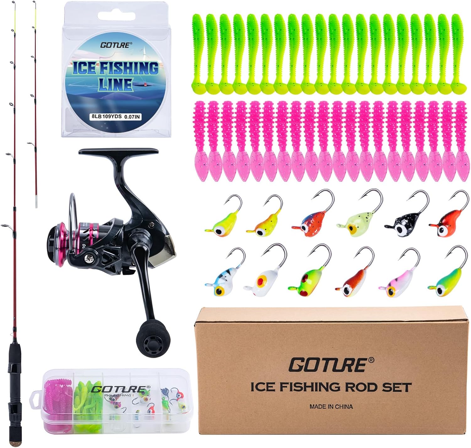 The Goture Ice Fishing Rod Reel Combo is a complete starter kit for winter anglers. Featuring a double-tip rod for versatility, a smooth reel, and a 52-piece jig set, it provides everything needed for a successful ice fishing trip. Ideal for targeting various fish species.