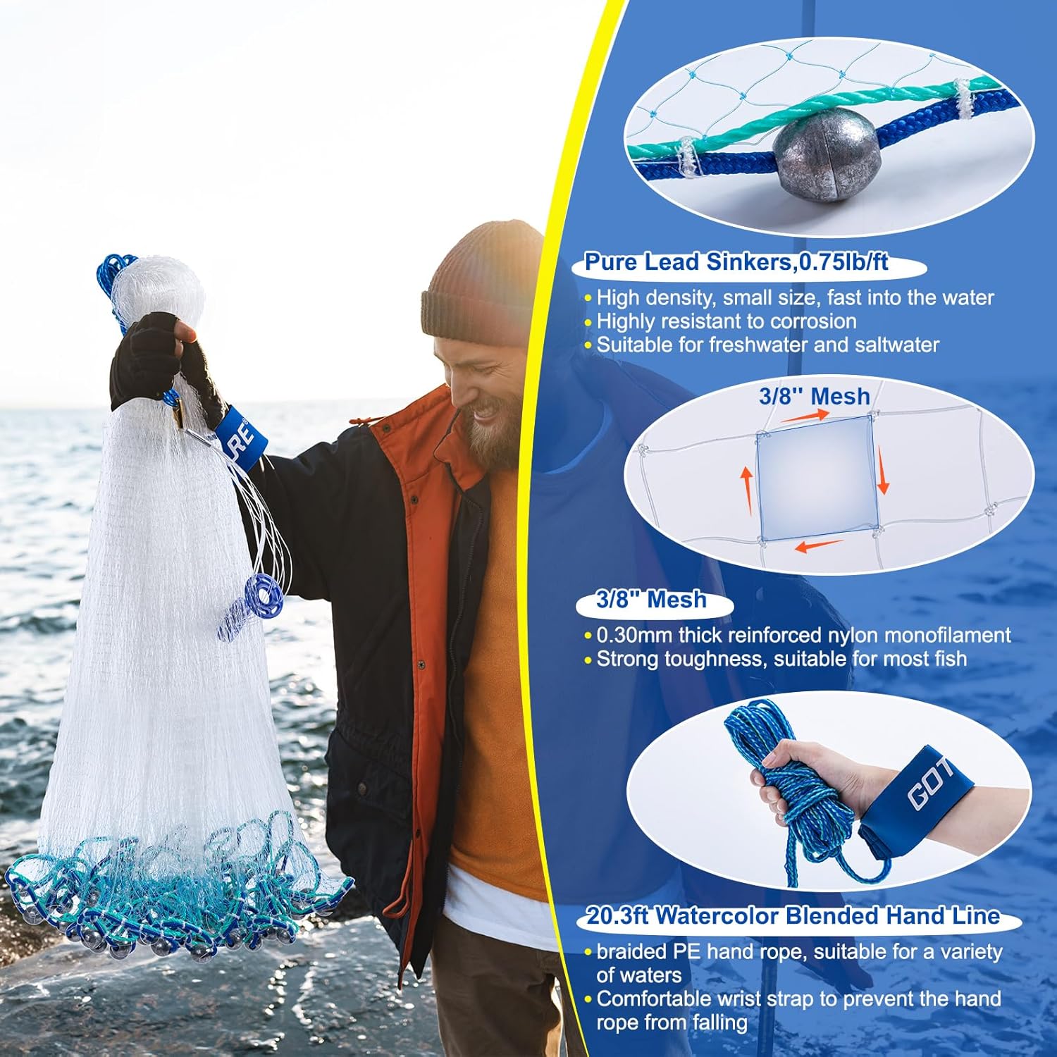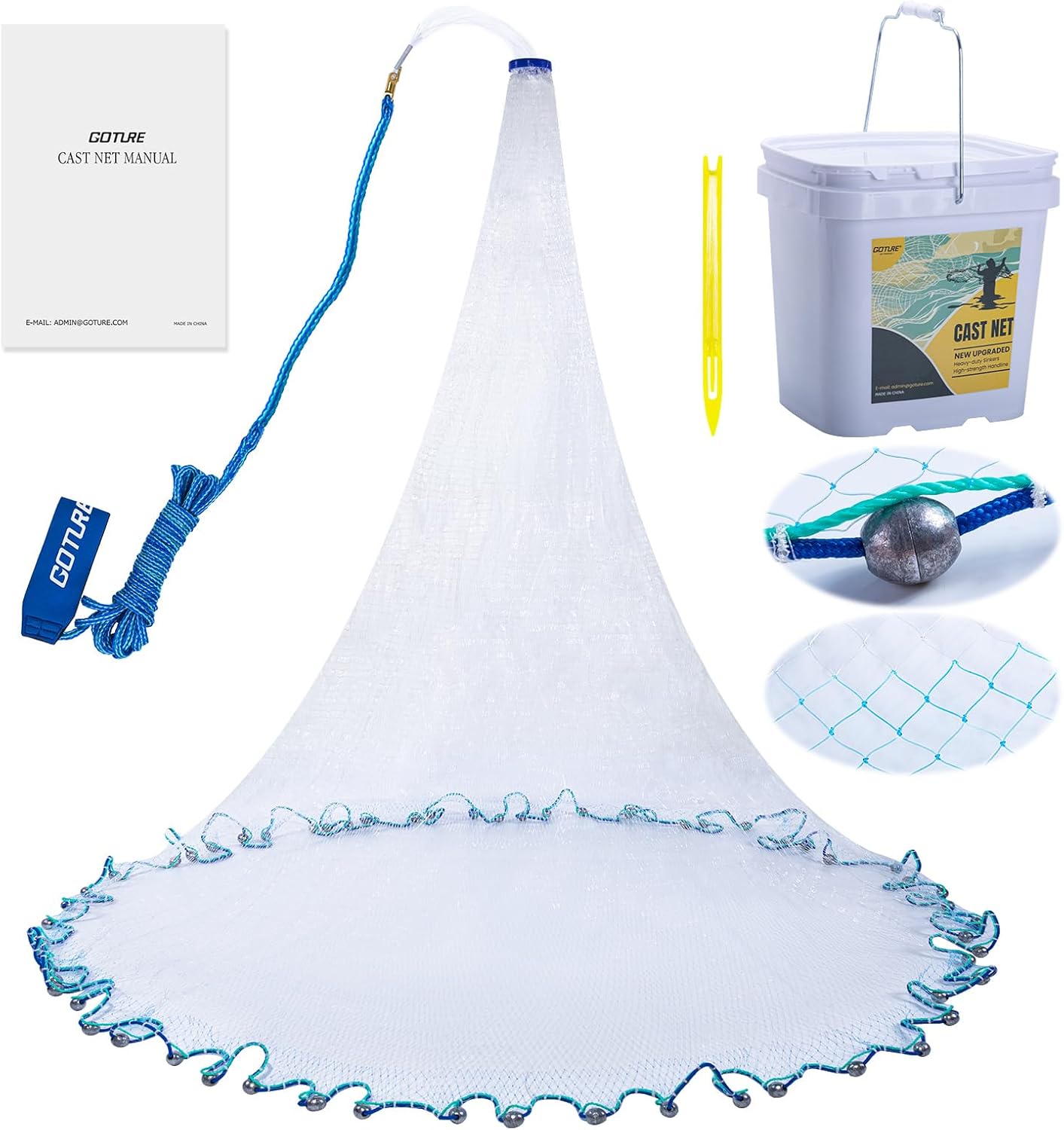 The Goture 3ft Cast Net with 3/8-inch mesh is ideal for catching bait fish with ease. Designed for both saltwater and freshwater fishing, it features durable materials and pure lead sinkers for smooth and accurate throws. Perfect for anglers seeking reliable performance.