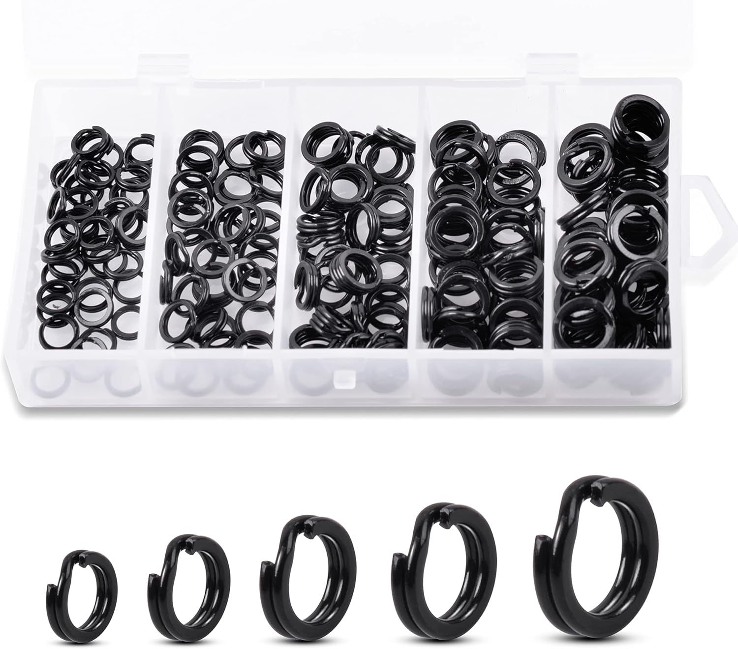 Durable stainless steel split rings designed for secure lure attachment. Corrosion-resistant material for both saltwater and freshwater fishing. High tensile strength ensures reliability in various fishing conditions. Includes a convenient storage box for easy organization and transport.