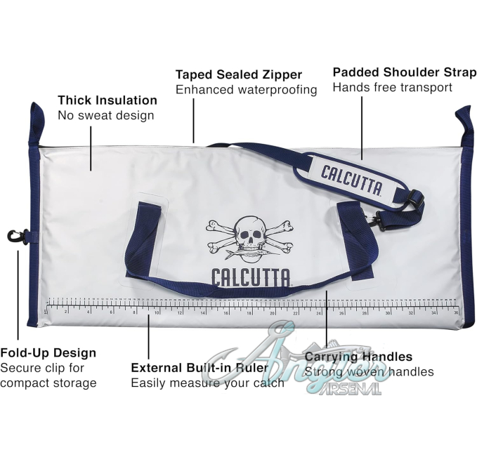 The Calcutta Insulated Fish Bag is designed to keep your catch fresh and cool for up to 24 hours. This waterproof fish cooler features durable nylon carrying straps for easy transport, making it perfect for any fishing trip. The built-in ruler allows for quick and accurate measurement of your fish, ensuring you meet size regulations. With its robust construction and insulation, this fish kill bag is an essential accessory for anglers who want to preserve their catch. Keep your fish secure and fresh with this reliable cooler from Angler Arsenal.